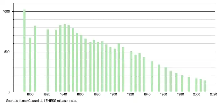 L'évolution du nombre d'habitants est connue à travers les recensements de la population effectués dans la commune depuis 1793. À partir du , les populations légales des communes sont publiées annuellement dans le cadre d'un recensement qui repose désormais sur une collecte d'information annuelle, concernant successivement tous les territoires communaux au cours d'une période de cinq ans. Pour les communes de moins de 10 000 habitants, une enquête de recensement portant sur toute la population est réalisée tous les cinq ans, les populations légales des années intermédiaires étant quant à elles estimées par interpolation ou extrapolation[6]. Pour la commune, le premier recensement exhaustif entrant dans le cadre du nouveau dispositif a été réalisé en 2004[7],[Note 1].