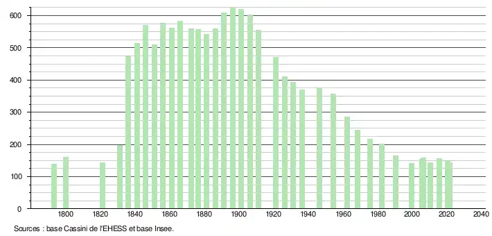 L'évolution du nombre d'habitants est connue à travers les recensements de la population effectués dans la commune depuis 1793. Pour les communes de moins de 10 000 habitants, une enquête de recensement portant sur toute la population est réalisée tous les cinq ans, les populations légales des années intermédiaires étant quant à elles estimées par interpolation ou extrapolation[22]. Pour la commune, le premier recensement exhaustif entrant dans le cadre du nouveau dispositif a été réalisé en 2005[23].