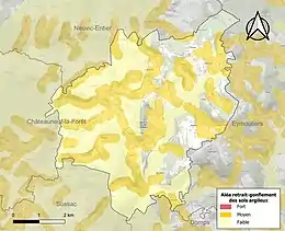 Le retrait-gonflement des sols argileux est susceptible d'engendrer des dommages importants aux bâtiments en cas d’alternance de périodes de sécheresse et de pluie[17]. 43,1 % de la superficie communale est en aléa moyen ou fort (27 % au niveau départemental et 48,5 % au niveau national métropolitain)[Carte 2]. Depuis le , en application de la loi ÉLAN, différentes contraintes s'imposent aux vendeurs, maîtres d'ouvrages ou constructeurs de biens situés dans une zone classée en aléa moyen ou fort[Note 3],[18].
