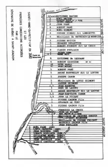 Sur le plan terrier de 1658, on lit les noms des premiers colons : Jean Picard, Jean-Baptiste Caron, Pierre Gasnier, Renée de la Voie, Claude Bouchard, Louis Guimond, Julien Fortin, Robert Caron, Pierre Picard, Louis Gagné, Julien Mercier, Robert Giguère, Étienne de Lessard, Claude Poulin, Robert Foubert dit Lacroix, George Pelletier, Jean Levasseur, Mathurin Meunier, Pierre Simard, Pierre Gibouin, Robert Paré, Jean Épée, Jean Paré, Robert Anezt, Louis Houde, Jacques Gamache, Noël Racine, Étienne Racine, Robert Drouin.