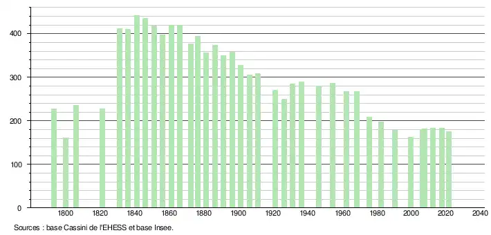 L'évolution du nombre d'habitants est connue à travers les recensements de la population effectués dans la commune depuis 1793. Pour les communes de moins de 10 000 habitants, une enquête de recensement portant sur toute la population est réalisée tous les cinq ans, les populations légales des années intermédiaires étant quant à elles estimées par interpolation ou extrapolation[19]. Pour la commune, le premier recensement exhaustif entrant dans le cadre du nouveau dispositif a été réalisé en 2007[20].