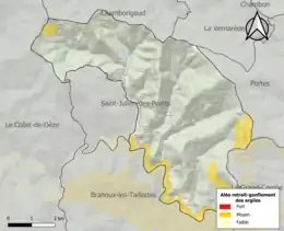La commune est vulnérable au risque de mouvements de terrains constitué principalement du retrait-gonflement des sols argileux[24]. Cet aléa est susceptible d'engendrer des dommages importants aux bâtiments en cas d’alternance de périodes de sécheresse et de pluie. 8,7 % de la superficie communale est en aléa moyen ou fort (67,5 % au niveau départemental et 48,5 % au niveau national). Sur les 297 bâtiments dénombrés sur la commune en 2019, 45 sont en aléa moyen ou fort, soit 15 %, à comparer aux 90 % au niveau départemental et 54 % au niveau national. Une cartographie de l'exposition du territoire national au retrait gonflement des sols argileux est disponible sur le site du BRGM[25],[Carte 2].