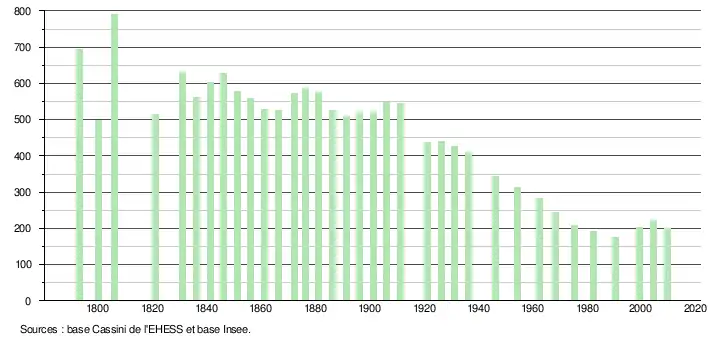 L'évolution du nombre d'habitants est connue à travers les recensements de la population effectués dans la commune depuis 1793. À partir du , les populations légales des communes sont publiées annuellement dans le cadre d'un recensement qui repose désormais sur une collecte d'information annuelle, concernant successivement tous les territoires communaux au cours d'une période de cinq ans. Pour les communes de moins de 10 000 habitants, une enquête de recensement portant sur toute la population est réalisée tous les cinq ans, les populations légales des années intermédiaires étant quant à elles estimées par interpolation ou extrapolation[4]. Pour la commune, le premier recensement exhaustif entrant dans le cadre du nouveau dispositif a été réalisé en 2004[5],[Note 1].