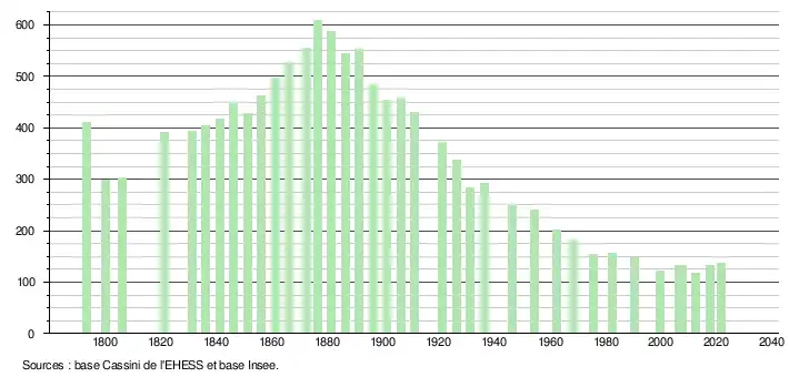 L'évolution du nombre d'habitants est connue à travers les recensements de la population effectués dans la commune depuis 1793. Pour les communes de moins de 10 000 habitants, une enquête de recensement portant sur toute la population est réalisée tous les cinq ans, les populations légales des années intermédiaires étant quant à elles estimées par interpolation ou extrapolation[29]. Pour la commune, le premier recensement exhaustif entrant dans le cadre du nouveau dispositif a été réalisé en 2007[30].