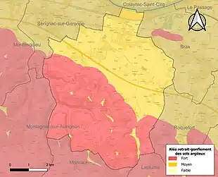 Le retrait-gonflement des sols argileux est susceptible d'engendrer des dommages importants aux bâtiments en cas d’alternance de périodes de sécheresse et de pluie[22]. La totalité de la commune est en aléa moyen ou fort (91,8 % au niveau départemental et 48,5 % au niveau national)[Carte 2]. Depuis le , en application de la loi ELAN, différentes contraintes s'imposent aux vendeurs, maîtres d'ouvrages ou constructeurs de biens situés dans une zone classée en aléa moyen ou fort[Note 4],[23].