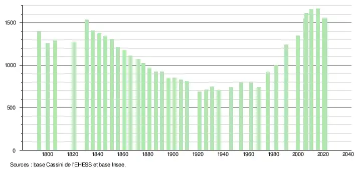 L'évolution du nombre d'habitants est connue à travers les recensements de la population effectués dans la commune depuis 1793. Pour les communes de moins de 10 000 habitants, une enquête de recensement portant sur toute la population est réalisée tous les cinq ans, les populations légales des années intermédiaires étant quant à elles estimées par interpolation ou extrapolation[28]. Pour la commune, le premier recensement exhaustif entrant dans le cadre du nouveau dispositif a été réalisé en 2005[29].