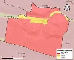 Le retrait-gonflement des sols argileux est susceptible d'engendrer des dommages importants aux bâtiments en cas d’alternance de périodes de sécheresse et de pluie. La totalité de la commune est en aléa moyen ou fort (75,2 % au niveau départemental et 48,5 % au niveau national). Sur les 337 bâtiments dénombrés sur la commune en 2019, 337 sont en aléa moyen ou fort, soit 100 %, à comparer aux 94 % au niveau départemental et 54 % au niveau national. Une cartographie de l'exposition du territoire national au retrait gonflement des sols argileux est disponible sur le site du BRGM[27],[Carte 3].