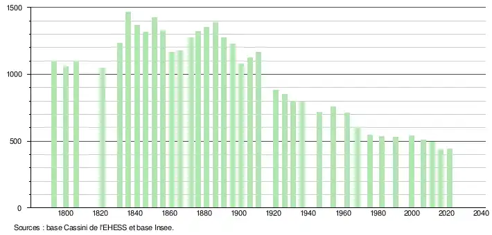 L'évolution du nombre d'habitants est connue à travers les recensements de la population effectués dans la commune depuis 1793. Pour les communes de moins de 10 000 habitants, une enquête de recensement portant sur toute la population est réalisée tous les cinq ans, les populations légales des années intermédiaires étant quant à elles estimées par interpolation ou extrapolation[29]. Pour la commune, le premier recensement exhaustif entrant dans le cadre du nouveau dispositif a été réalisé en 2006[30].