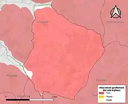 Le retrait-gonflement des sols argileux est susceptible d'engendrer des dommages importants aux bâtiments en cas d’alternance de périodes de sécheresse et de pluie. 97,8 % de la superficie communale est en aléa moyen ou fort (54,2 % au niveau départemental et 48,5 % au niveau national). Sur les 60 bâtiments dénombrés sur la commune en 2019, 60 sont en aléa moyen ou fort, soit 100 %, à comparer aux 57 % au niveau départemental et 54 % au niveau national. Une cartographie de l'exposition du territoire national au retrait gonflement des sols argileux est disponible sur le site du BRGM[11],[Carte 2].