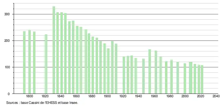 L'évolution du nombre d'habitants est connue à travers les recensements de la population effectués dans la commune depuis 1793. Pour les communes de moins de 10 000 habitants, une enquête de recensement portant sur toute la population est réalisée tous les cinq ans, les populations légales des années intermédiaires étant quant à elles estimées par interpolation ou extrapolation[18]. Pour la commune, le premier recensement exhaustif entrant dans le cadre du nouveau dispositif a été réalisé en 2007[19].