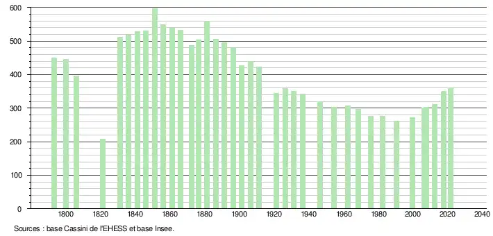 L'évolution du nombre d'habitants est connue à travers les recensements de la population effectués dans la commune depuis 1793. Pour les communes de moins de 10 000 habitants, une enquête de recensement portant sur toute la population est réalisée tous les cinq ans, les populations légales des années intermédiaires étant quant à elles estimées par interpolation ou extrapolation[28]. Pour la commune, le premier recensement exhaustif entrant dans le cadre du nouveau dispositif a été réalisé en 2007[29].