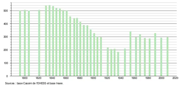 L'évolution du nombre d'habitants est connue à travers les recensements de la population effectués dans la commune depuis 1793. À partir du , les populations légales des communes sont publiées annuellement dans le cadre d'un recensement qui repose désormais sur une collecte d'information annuelle, concernant successivement tous les territoires communaux au cours d'une période de cinq ans. Pour les communes de moins de 10 000 habitants, une enquête de recensement portant sur toute la population est réalisée tous les cinq ans, les populations légales des années intermédiaires étant quant à elles estimées par interpolation ou extrapolation[7]. Pour la commune, le premier recensement exhaustif entrant dans le cadre du nouveau dispositif a été réalisé en 2008[8],[Note 2].