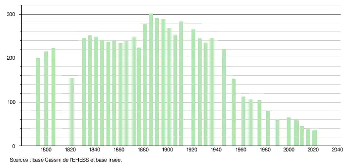 L'évolution du nombre d'habitants est connue à travers les recensements de la population effectués dans la commune depuis 1793. Pour les communes de moins de 10 000 habitants, une enquête de recensement portant sur toute la population est réalisée tous les cinq ans, les populations légales des années intermédiaires étant quant à elles estimées par interpolation ou extrapolation[26]. Pour la commune, le premier recensement exhaustif entrant dans le cadre du nouveau dispositif a été réalisé en 2005[27].