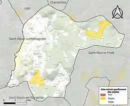 Le retrait-gonflement des sols argileux est susceptible d'engendrer des dommages importants aux bâtiments en cas d’alternance de périodes de sécheresse et de pluie. 5,8 % de la superficie communale est en aléa moyen ou fort (15,8 % au niveau départemental et 48,5 % au niveau national). Sur les 59 bâtiments dénombrés sur la commune en 2019, 1 sont en aléa moyen ou fort, soit 2 %, à comparer aux 14 % au niveau départemental et 54 % au niveau national. Une cartographie de l'exposition du territoire national au retrait gonflement des sols argileux est disponible sur le site du BRGM[23],[Carte 2].