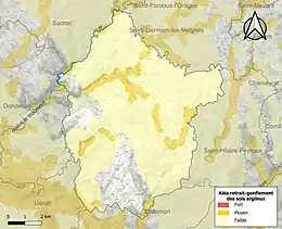Le retrait-gonflement des sols argileux est susceptible d'engendrer des dommages importants aux bâtiments en cas d’alternance de périodes de sécheresse et de pluie. 11,8 % de la superficie communale est en aléa moyen ou fort (26,8 % au niveau départemental et 48,5 % au niveau national). Sur les 924 bâtiments dénombrés sur la commune en 2019, 31 sont en aléa moyen ou fort, soit 3 %, à comparer aux 36 % au niveau départemental et 54 % au niveau national. Une cartographie de l'exposition du territoire national au retrait gonflement des sols argileux est disponible sur le site du BRGM[21],[Carte 2].