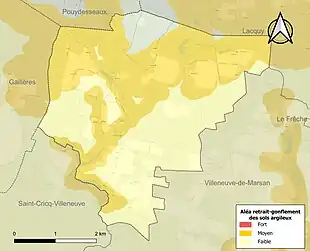 Le retrait-gonflement des sols argileux est susceptible d'engendrer des dommages importants aux bâtiments en cas d’alternance de périodes de sécheresse et de pluie. 52,4 % de la superficie communale est en aléa moyen ou fort (19,2 % au niveau départemental et 48,5 % au niveau national). Sur les 111 bâtiments dénombrés sur la commune en 2019, 71 sont en aléa moyen ou fort, soit 64 %, à comparer aux 17 % au niveau départemental et 54 % au niveau national. Une cartographie de l'exposition du territoire national au retrait gonflement des sols argileux est disponible sur le site du BRGM[20],[Carte 2].