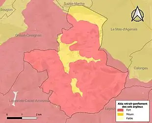 Le retrait-gonflement des sols argileux est susceptible d'engendrer des dommages importants aux bâtiments en cas d’alternance de périodes de sécheresse et de pluie[19]. La totalité de la commune est en aléa moyen ou fort (91,8 % au niveau départemental et 48,5 % au niveau national)[Carte 2]. Depuis le , en application de la loi ELAN, différentes contraintes s'imposent aux vendeurs, maîtres d'ouvrages ou constructeurs de biens situés dans une zone classée en aléa moyen ou fort[Note 3],[20].