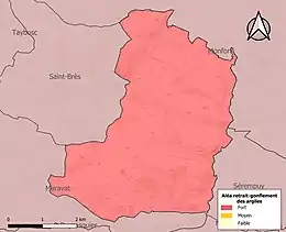 Le retrait-gonflement des sols argileux est susceptible d'engendrer des dommages importants aux bâtiments en cas d’alternance de périodes de sécheresse et de pluie. La totalité de la commune est en aléa moyen ou fort (94,5 % au niveau départemental et 48,5 % au niveau national). Sur les 75 bâtiments dénombrés sur la commune en 2019, 75 sont en aléa moyen ou fort, soit 100 %, à comparer aux 93 % au niveau départemental et 54 % au niveau national. Une cartographie de l'exposition du territoire national au retrait gonflement des sols argileux est disponible sur le site du BRGM[19],[Carte 3].