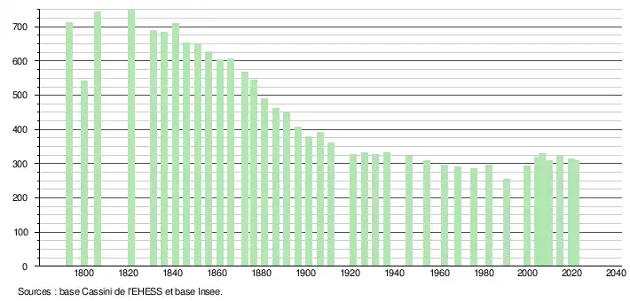 L'évolution du nombre d'habitants est connue à travers les recensements de la population effectués dans la commune depuis 1793. Pour les communes de moins de 10 000 habitants, une enquête de recensement portant sur toute la population est réalisée tous les cinq ans, les populations légales des années intermédiaires étant quant à elles estimées par interpolation ou extrapolation[25]. Pour la commune, le premier recensement exhaustif entrant dans le cadre du nouveau dispositif a été réalisé en 2004[26].
