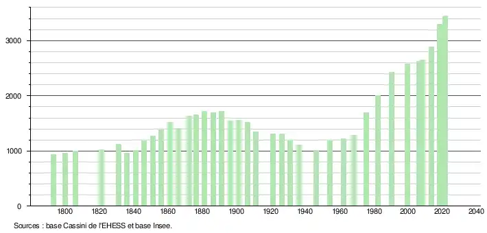 L'évolution du nombre d'habitants est connue à travers les recensements de la population effectués dans la commune depuis 1793. Pour les communes de moins de 10 000 habitants, une enquête de recensement portant sur toute la population est réalisée tous les cinq ans, les populations légales des années intermédiaires étant quant à elles estimées par interpolation ou extrapolation[28]. Pour la commune, le premier recensement exhaustif entrant dans le cadre du nouveau dispositif a été réalisé en 2008[29].
