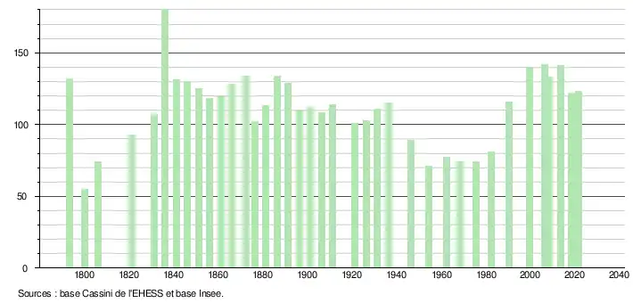 L'évolution du nombre d'habitants est connue à travers les recensements de la population effectués dans la commune depuis 1793. Pour les communes de moins de 10 000 habitants, une enquête de recensement portant sur toute la population est réalisée tous les cinq ans, les populations légales des années intermédiaires étant quant à elles estimées par interpolation ou extrapolation[34]. Pour la commune, le premier recensement exhaustif entrant dans le cadre du nouveau dispositif a été réalisé en 2008[35].