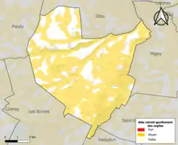 Le retrait-gonflement des sols argileux est susceptible d'engendrer des dommages importants aux bâtiments en cas d’alternance de périodes de sécheresse et de pluie. 73,6 % de la superficie communale est en aléa moyen ou fort (84,7 % au niveau départemental et 48,5 % au niveau national). Sur les 591 bâtiments dénombrés sur la commune en 2019, 530 sont en aléa moyen ou fort, soit 90 %, à comparer aux 86 % au niveau départemental et 54 % au niveau national. Une cartographie de l'exposition du territoire national au retrait gonflement des sols argileux est disponible sur le site du BRGM[24],[25].