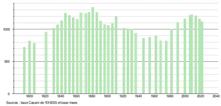 L'évolution du nombre d'habitants est connue à travers les recensements de la population effectués dans la commune depuis 1793. Pour les communes de moins de 10 000 habitants, une enquête de recensement portant sur toute la population est réalisée tous les cinq ans, les populations légales des années intermédiaires étant quant à elles estimées par interpolation ou extrapolation[39]. Pour la commune, le premier recensement exhaustif entrant dans le cadre du nouveau dispositif a été réalisé en 2008[40].