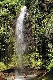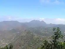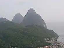 Sainte-Lucie est une île volcanique et culmine à 950 m d'altitude au mont Gimie[16]. Les pitons de Sainte-Lucie, qui sont au nombre de deux, font partie de la chaîne volcanique du Qualibou, également appelé Soufrière, volcan principal de l'île. Ces pitons ressemblent à deux aiguilles géantes émergeant des abîmes océaniques, et procurent au paysage de Sainte-Lucie force et caractère. Appelés Gros Piton et Petit Piton, ils culminent respectivement à 786 mètres et à 743 mètres d'altitude. Les deux sont reliés par la crête d'un autre piton : le piton Mitan. Au sein du site volcanique, la présence d'un champ géothermique, comportant des sources chaudes et dégageant des fumeroles de soufre, montre que l'activité volcanique est toujours d’actualité. Ils font partie des sites inscrits au patrimoine mondial de l'UNESCO.