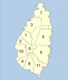 Sainte-Lucie est également divisée en dix-sept districts électoraux pour les élections législatives : Canaries & Anse-la-Raye, Babonneau, Castries Central, Castries North, Castries North East, Castries South, Castries South East, Choiseul, Dennery North, Dennery South, Gros Islet, Laborie, Micoud North, Micoud South, Soufriere, Vieux Fort North et Vieux Fort South.