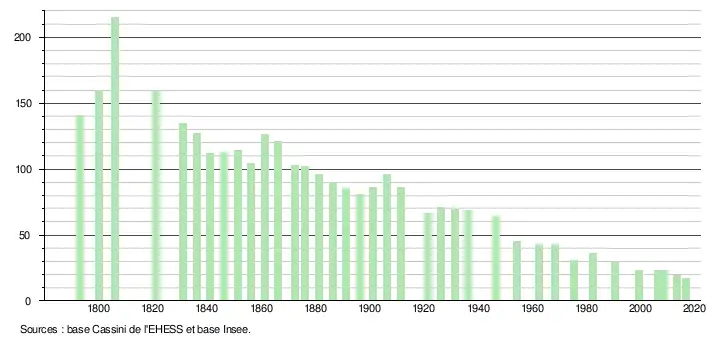 L'évolution du nombre d'habitants est connue à travers les recensements de la population effectués dans la commune depuis 1793. Pour les communes de moins de 10 000 habitants, une enquête de recensement portant sur toute la population est réalisée tous les cinq ans, les populations légales des années intermédiaires étant quant à elles estimées par interpolation ou extrapolation[2]. Pour la commune, le premier recensement exhaustif entrant dans le cadre du nouveau dispositif a été réalisé en 2008[3].