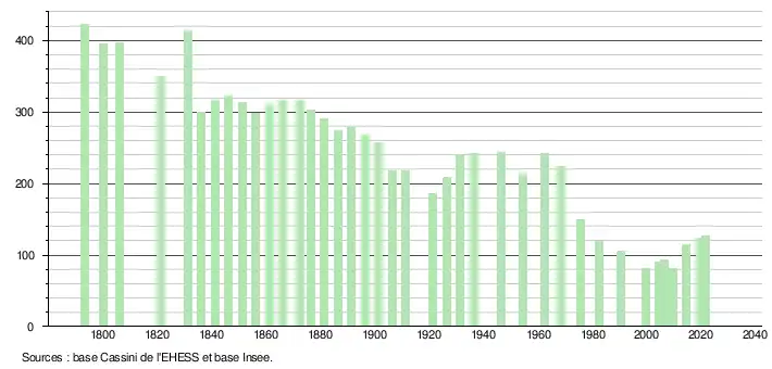 L'évolution du nombre d'habitants est connue à travers les recensements de la population effectués dans la commune depuis 1793. Pour les communes de moins de 10 000 habitants, une enquête de recensement portant sur toute la population est réalisée tous les cinq ans, les populations légales des années intermédiaires étant quant à elles estimées par interpolation ou extrapolation[28]. Pour la commune, le premier recensement exhaustif entrant dans le cadre du nouveau dispositif a été réalisé en 2004[29].