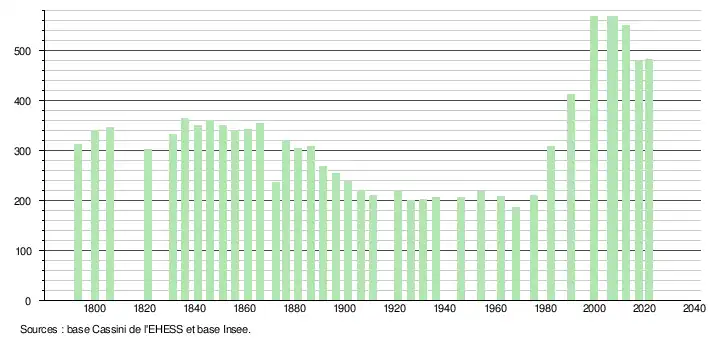 L'évolution du nombre d'habitants est connue à travers les recensements de la population effectués dans la commune depuis 1793. Pour les communes de moins de 10 000 habitants, une enquête de recensement portant sur toute la population est réalisée tous les cinq ans, les populations légales des années intermédiaires étant quant à elles estimées par interpolation ou extrapolation[21]. Pour la commune, le premier recensement exhaustif entrant dans le cadre du nouveau dispositif a été réalisé en 2007[22].