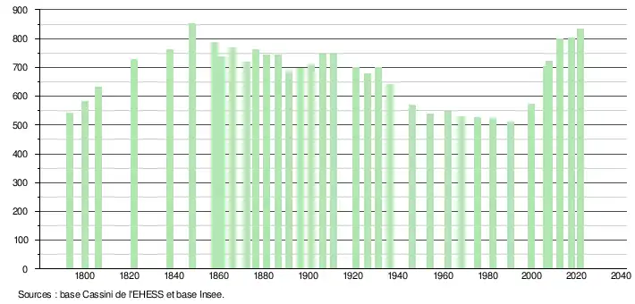 L'évolution du nombre d'habitants est connue à travers les recensements de la population effectués dans la commune depuis 1793. Pour les communes de moins de 10 000 habitants, une enquête de recensement portant sur toute la population est réalisée tous les cinq ans, les populations légales des années intermédiaires étant quant à elles estimées par interpolation ou extrapolation[12]. Pour la commune, le premier recensement exhaustif entrant dans le cadre du nouveau dispositif a été réalisé en 2007[13].