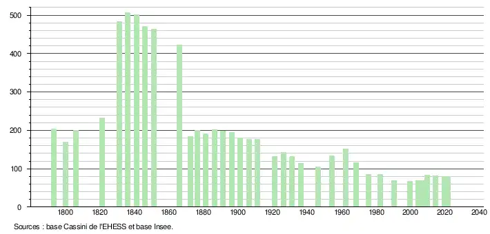 L'évolution du nombre d'habitants est connue à travers les recensements de la population effectués dans la commune depuis 1793. Pour les communes de moins de 10 000 habitants, une enquête de recensement portant sur toute la population est réalisée tous les cinq ans, les populations légales des années intermédiaires étant quant à elles estimées par interpolation ou extrapolation[14]. Pour la commune, le premier recensement exhaustif entrant dans le cadre du nouveau dispositif a été réalisé en 2004[15].