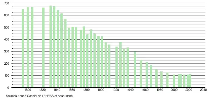 - Population municipale légale en vigueur au 1er janvier 2024, millésimée 2021, définie dans les limites territoriales en vigueur au 1er janvier 2023, date de référence statistique : 1er janvier 2021.