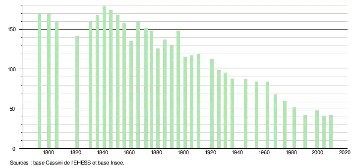 L'évolution du nombre d'habitants est connue à travers les recensements de la population effectués dans la commune depuis 1793. À partir du , les populations légales des communes sont publiées annuellement dans le cadre d'un recensement qui repose désormais sur une collecte d'information annuelle, concernant successivement tous les territoires communaux au cours d'une période de cinq ans. Pour les communes de moins de 10 000 habitants, une enquête de recensement portant sur toute la population est réalisée tous les cinq ans, les populations légales des années intermédiaires étant quant à elles estimées par interpolation ou extrapolation[2]. Pour la commune, le premier recensement exhaustif entrant dans le cadre du nouveau dispositif a été réalisé en 2004[3],[Note 1].