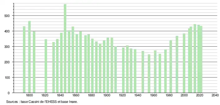 L'évolution du nombre d'habitants est connue à travers les recensements de la population effectués dans la commune depuis 1793. Pour les communes de moins de 10 000 habitants, une enquête de recensement portant sur toute la population est réalisée tous les cinq ans, les populations légales des années intermédiaires étant quant à elles estimées par interpolation ou extrapolation[22]. Pour la commune, le premier recensement exhaustif entrant dans le cadre du nouveau dispositif a été réalisé en 2008[23].