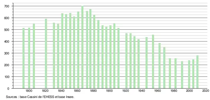 L'évolution du nombre d'habitants est connue à travers les recensements de la population effectués dans la commune depuis 1793. À partir du , les populations légales des communes sont publiées annuellement dans le cadre d'un recensement qui repose désormais sur une collecte d'information annuelle, concernant successivement tous les territoires communaux au cours d'une période de cinq ans. Pour les communes de moins de 10 000 habitants, une enquête de recensement portant sur toute la population est réalisée tous les cinq ans, les populations légales des années intermédiaires étant quant à elles estimées par interpolation ou extrapolation[9]. Pour la commune, le premier recensement exhaustif entrant dans le cadre du nouveau dispositif a été réalisé en 2004[10],[Note 1].