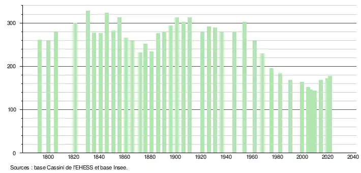 L'évolution du nombre d'habitants est connue à travers les recensements de la population effectués dans la commune depuis 1793. Pour les communes de moins de 10 000 habitants, une enquête de recensement portant sur toute la population est réalisée tous les cinq ans, les populations légales des années intermédiaires étant quant à elles estimées par interpolation ou extrapolation[30]. Pour la commune, le premier recensement exhaustif entrant dans le cadre du nouveau dispositif a été réalisé en 2004[31].