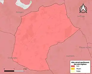 Les mouvements de terrains susceptibles de se produire sur la commune sont des tassements différentiels[17]. Le retrait-gonflement des sols argileux est susceptible d'engendrer des dommages importants aux bâtiments en cas d’alternance de périodes de sécheresse et de pluie[18]. La totalité de la commune est en aléa moyen ou fort (79,5 % au niveau départemental et 48,5 % au niveau national)[Carte 2]. Depuis le , en application de la loi ÉLAN, différentes contraintes s'imposent aux vendeurs, maîtres d'ouvrages ou constructeurs de biens situés dans une zone classée en aléa moyen ou fort[Note 3],[19].