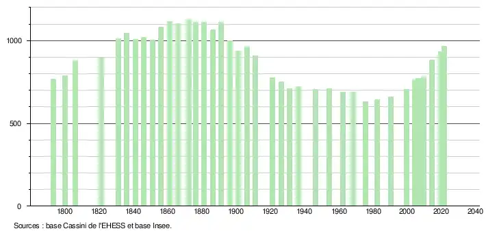 L'évolution du nombre d'habitants est connue à travers les recensements de la population effectués dans la commune depuis 1793. Pour les communes de moins de 10 000 habitants, une enquête de recensement portant sur toute la population est réalisée tous les cinq ans, les populations légales des années intermédiaires étant quant à elles estimées par interpolation ou extrapolation[20]. Pour la commune, le premier recensement exhaustif entrant dans le cadre du nouveau dispositif a été réalisé en 2004[21].