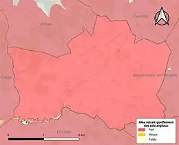 Les mouvements de terrains susceptibles de se produire sur la commune sont des tassements différentiels[38]. Le retrait-gonflement des sols argileux est susceptible d'engendrer des dommages importants aux bâtiments en cas d’alternance de périodes de sécheresse et de pluie[39]. 99,7 % de la superficie communale est en aléa moyen ou fort (58,6 % au niveau départemental et 48,5 % au niveau national métropolitain)[Carte 4]. Depuis le , en application de la loi ÉLAN, différentes contraintes s'imposent aux vendeurs, maîtres d'ouvrages ou constructeurs de biens situés dans une zone classée en aléa moyen ou fort[Note 4],[40].