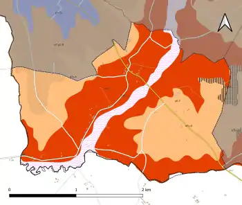 L'occupation des sols de la commune, telle qu'elle ressort de la base de données européenne d’occupation biophysique des sols Corine Land Cover (CLC), est marquée par l'importance des territoires agricoles (93 % en 2018), une proportion identique à celle de 1990 (93 %). La répartition détaillée en 2018 est la suivante : terres arables (77,5 %), prairies (13,5 %), forêts (7 %), zones agricoles hétérogènes (2 %)[32]. L'évolution de l’occupation des sols de la commune et de ses infrastructures peut être observée sur les différentes représentations cartographiques du territoire : la carte de Cassini (XVIIIe siècle), la carte d'état-major (1820-1866) et les cartes ou photos aériennes de l'IGN pour la période actuelle (1950 à aujourd'hui)[Carte 3].