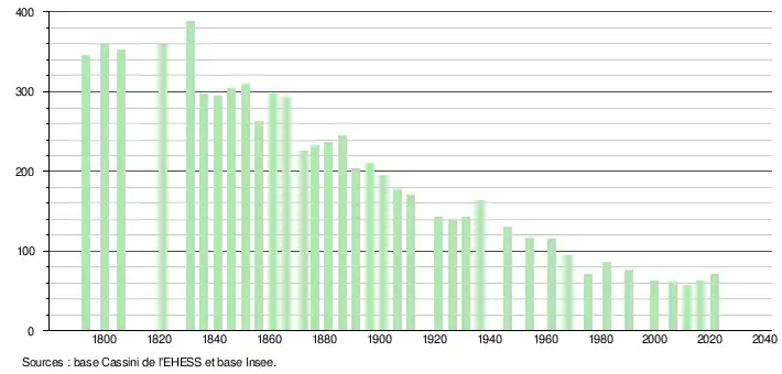 L'évolution du nombre d'habitants est connue à travers les recensements de la population effectués dans la commune depuis 1793. Pour les communes de moins de 10 000 habitants, une enquête de recensement portant sur toute la population est réalisée tous les cinq ans, les populations légales des années intermédiaires étant quant à elles estimées par interpolation ou extrapolation[48]. Pour la commune, le premier recensement exhaustif entrant dans le cadre du nouveau dispositif a été réalisé en 2006[49].