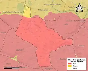 Le retrait-gonflement des sols argileux est susceptible d'engendrer des dommages importants aux bâtiments en cas d’alternance de périodes de sécheresse et de pluie. La totalité de la commune est en aléa moyen ou fort (67,4 % au niveau départemental et 48,5 % au niveau national). Sur les 245 bâtiments dénombrés sur la commune en 2019, 245 sont en aléa moyen ou fort, soit 100 %, à comparer aux 84 % au niveau départemental et 54 % au niveau national. Une cartographie de l'exposition du territoire national au retrait gonflement des sols argileux est disponible sur le site du BRGM[17],[Carte 2].