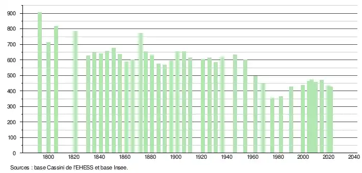 L'évolution du nombre d'habitants est connue à travers les recensements de la population effectués dans la commune depuis 1793. Pour les communes de moins de 10 000 habitants, une enquête de recensement portant sur toute la population est réalisée tous les cinq ans, les populations légales des années intermédiaires étant quant à elles estimées par interpolation ou extrapolation[24]. Pour la commune, le premier recensement exhaustif entrant dans le cadre du nouveau dispositif a été réalisé en 2004[25].