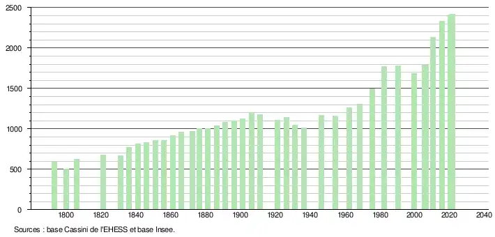 L'évolution du nombre d'habitants est connue à travers les recensements de la population effectués dans la commune depuis 1793. Pour les communes de moins de 10 000 habitants, une enquête de recensement portant sur toute la population est réalisée tous les cinq ans, les populations légales des années intermédiaires étant quant à elles estimées par interpolation ou extrapolation[14]. Pour la commune, le premier recensement exhaustif entrant dans le cadre du nouveau dispositif a été réalisé en 2005[15].