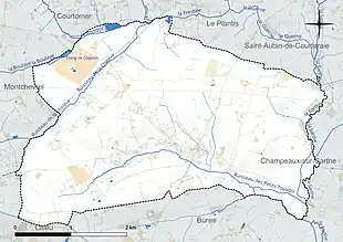 Les communes limitrophes sont Montchevrel, Bures, Champeaux-sur-Sarthe, Saint-Aubin-de-Courteraie, Le Plantis, Courtomer et Laleu.