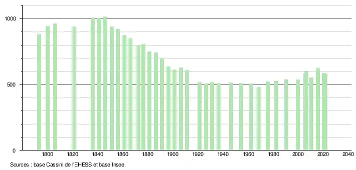 L'évolution du nombre d'habitants est connue à travers les recensements de la population effectués dans la commune depuis 1793. Pour les communes de moins de 10 000 habitants, une enquête de recensement portant sur toute la population est réalisée tous les cinq ans, les populations légales des années intermédiaires étant quant à elles estimées par interpolation ou extrapolation[22]. Pour la commune, le premier recensement exhaustif entrant dans le cadre du nouveau dispositif a été réalisé en 2005[23].