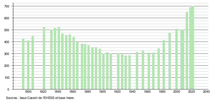 L'évolution du nombre d'habitants est connue à travers les recensements de la population effectués dans la commune depuis 1793. Pour les communes de moins de 10 000 habitants, une enquête de recensement portant sur toute la population est réalisée tous les cinq ans, les populations légales des années intermédiaires étant quant à elles estimées par interpolation ou extrapolation[23]. Pour la commune, le premier recensement exhaustif entrant dans le cadre du nouveau dispositif a été réalisé en 2008[24].
